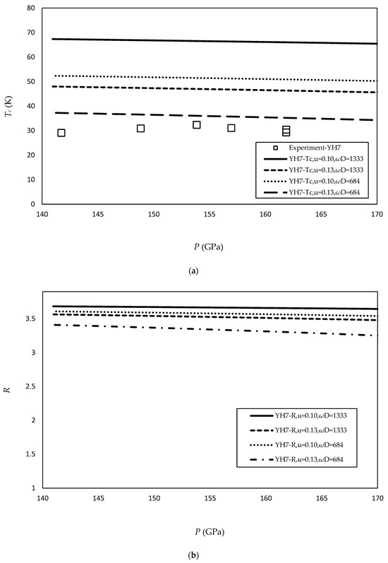 The numerical calculations for (a) the critical temperature (Tc) and (b) the gap-to-Tc ratio (R) for the YH7 superconductor.