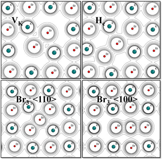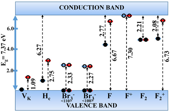 The electron-hole mechanism is considered one of the main processes leading to the creation of Frenkel pairs (F-center + interstitial) in alkali halides [12,48,49,50]. Holes are trapped at the anion sites, creating neutral halogen atoms that are reactive and can move through the lattice, forming the dumbbell with regular ions. Here, we discuss four types of defects: the -center, where a single hole is trapped at two anion sites, resulting in a molecular ion lying along the <110> direction; the H-center, representing a neutral bromine interstitial trapped at the occupied anion site, also resulting in a molecular ion lying along the <110> direction, but in this case, it occupies a single anion site; the <110> defect, a combination of the latter two, involving two holes and one interstitial halogen ion; and the <100> defect—a bromine interstitial and a hole trapped at the cation vacancy site. Their electronic structures are shown in Figure 2. The calculated properties of all defects are presented in Table 2. For comparison purposes, we also calculated the free molecule and molecular ion.