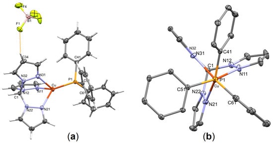 Attempts to observe possible intermediate species involved in the fluxional behaviour were carried out by recording the 1H, 31P{1H} and 19F{1H} NMR spectra at variable temperatures (Figures S3–S5), but no resonance attributable to species such as [Cu(κ2-CHpz3)(κ2-BF4)(PPh3)] was clearly detected. The 1H NMR spectrum maintains the symmetry of the coordinated C-scorpionate at 209 K also, with a broadening of the methine resonance upon lowering the temperature. On the other hand, the 31P{1H} NMR resonance becomes sharper at low temperature, whereas a weak enlargement of the 19F{1H} resonance was observed. It is likely to suppose that the fluxional mechanisms also remain too fast at temperatures close to the melting point of the solvent and that the relative energy of the intermediates is too high to have an appreciable concentration in solution.