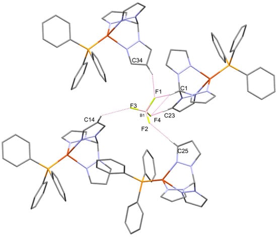 Non-classical hydrogen bonds in [Cu(CHpz3)(PPh3)][BF4]. Colour map: Cu, reddish-orange; P, orange; F, greenish yellow; N, blue; C, green; B, pink; H, white. Only the hydrogen atoms involved in hydrogen bonds are drawn.