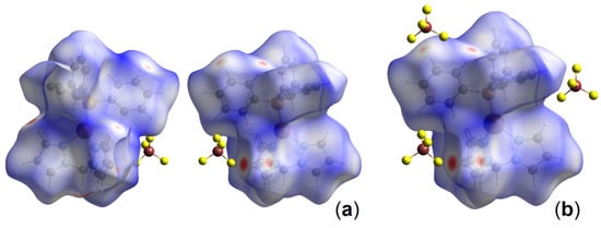 With the aim of deepening the knowledge about the supramolecular network, the Hirshfeld surface analysis was carried out. This technique allows for the investigation of the interactions in crystal structures through the visual recognition of several properties of intermolecular interactions (curvedness, shape index, dnorm, etc.) mapped onto proper surfaces. The surfaces were drawn in this paper by the representation of the normalized contact distance, dnorm, defined as the sum of di (the distance of the point from the nearest nucleus within the surface) and de (the distance of the point from the nearest nucleus outside the surface) normalised by the van der Waals radius of the atom involved [41]. The transparent surfaces shown in Figure 3 were calculated only for the cation to show the interactions with BF4− and are mapped over a dnorm range between −0.31 and 1.54 Å. The deep red spots visible on the dnorm surfaces are indicative of non-classical hydrogen-bonding contacts, most of them representing interactions with symmetry-related anions found in the network [67]. Related surfaces with other mapped quantities (di, de, curvedness and shape index) are collected in Supplementary Materials, Figure S2.