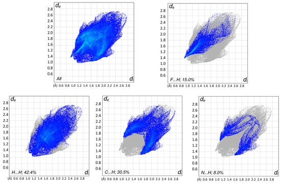 All the (di, de) contacts can be expressed in the form of a 2D fingerprint plot [43]. The shape of this plot, which is unique for each molecule, is determined by the dominating intermolecular contacts. The 2D fingerprint plot was constructed in this work by using reciprocal interactions, meaning that both X···Y and Y···X interactions were included in the fingerprints. The contributions of the individual interactions were also separated, and the relative percentages were assigned. In particular, Figure 4 shows the 2D fingerprint plots with the relative contributions to the Hirshfeld surface area of different pairs of atoms. As expected, van der Waals C···H (i.e., C-H···π) and H···H (i.e., π···π) close contacts provide the highest contributions, but the previously mentioned F···H close contacts are noteworthy since they represent 15% of the interactions and begin at about 1.2 + 0.9 Å as an acute spike. Therefore, they are present only in the external face of the surface (de) since the tetrafluoroborate anions are out of the calculated surface, and the plot is asymmetric, with only one spike due to these interactions.
