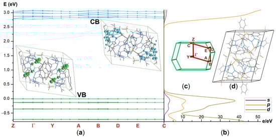 (a) Occupied (green) and empty bands (light blue) close to the VB and the CB and density plots of VB and CB (surface isovalue = 0.01 a.u.); (b) plot of the orbital contributions to the DOS; (c) reciprocal (green) lattice with path connecting selected k-points in red; (d) real lattice with cell content (colour map: Cu, reddish-orange; P, yellowish orange; F, greenish yellow; N, blue; C, grey; B, pink; H, white).