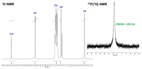 The 1H NMR spectrum of [Cu(CHpz3)(PPh3)][BF4] in CDCl3 at 300 K shows, besides the methine proton of CHpz3 at 9.44 ppm and the P-bonded aromatic rings between 7.65 and 7.40 ppm, three resonances related to the pyrazole rings at 8.43, 7.32 and 6.32 ppm. Despite the lack of equivalence of the Cu-N bonds observed in the crystal structure, the three pyrazole rings are thus equivalent in solution on the NMR timescale, indicating fluxional behaviour. Such a hypothesis is confirmed by the 31P{1H} NMR spectrum, where the single resonance of the coordinated phosphorus atom at 8.63 ppm appears broad, with full width at half maximum (FWHM) of 250 Hz (Figure 6).