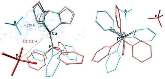 Two views of the DFT-optimized structure of [Cu(CHpz3)(PPh3)][BF4] (turquoise tones) superimposed to the closest cation–anion couple found in the X-ray structure (red tones). Hydrogen atoms are omitted for clarity. Selected bond lengths [Å] and angles [°]: Cu-N, 2.080, 2.087, 2.113; Cu-P, 2.162; N-Cu-N, 87.5, 87.6, 88.8; N-Cu-P, 125.4, 125.8, 128.8.