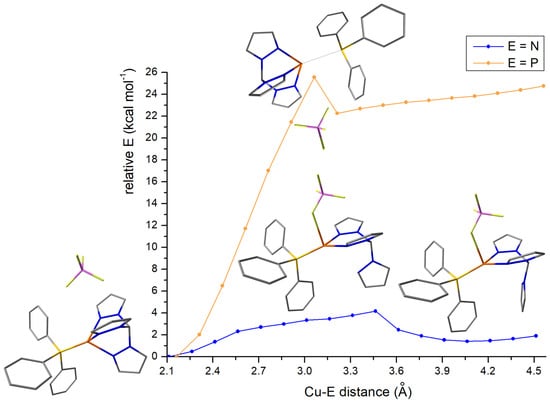The fluxionality of the compound was computationally investigated by employing relaxed surface scans involving the Cu-N and Cu-P bonds. The energy variations (electronic energy + nuclear repulsion) associated with the progressive elongation of the bonds are shown in Figure 8. The path related to the Cu-N dissociation is characterized by a very low energy barrier, estimated around 4.2 kcal mol−1, leading to a less stable local minimum compared to the starting geometry by only 1.4 kcal mol−1. The new geometry found can be described as a Cu(I) trigonal planar complex with two nitrogen and one phosphorus in the coordination sphere. One of the fluorine atoms of BF4− is close to the trigonal plane, about 2.4 Å away from the copper atom. It is therefore likely to suppose that the anion actively participates in the fluxional behaviour, stabilizing the coordinatively unsaturated trigonal complex. The ability of tetrafluoroborate to behave as a ligand towards Cu(I) in so-called coinage (or regium) bonds is well documented in the literature [68,69,70,71]. On the other hand, Figure 8 reveals that a fluxional path involving the Cu-P bond is much less competitive.