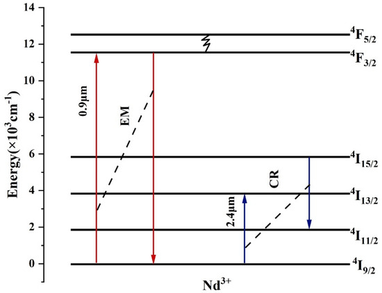 where X is either donor D or acceptor A. As the concentration of Nd3+ increases in the materials we use, the non-radiative relaxation rate increases due to ion–ion interactions. During the cross-relaxation (CR) process, the excited energy is initially located on one ion and is then partially transferred to neighboring ions. This results in both ions being left at lower energy levels, which rapidly decay to their respective ground states. The migration of the excited state through jump processes (Excited Migration, EM) does not extinguish the luminescence itself. Instead, it facilitates the movement of the excited state to a position where faster quenching occurs; thereby enhancing the process of multiphonon emission. Both CR and EM processes are examples of dipole–dipole non-radiative energy transfer mechanisms. According to the Forster–Dexter theory, the dipole–dipole transfer decreases inversely as the sixth power of the distance between the interaction centers. Therefore, simply put, CDD is related to the material’s EM process, while CDA is associated with the material’s CR process. These two processes will enable us to identify spectral overlap in the fluorescence emission cross section and absorption cross section of the material. Figure 1 shows the energy level diagram of Nd3+. It can be seen that the level gap between level 4I15/2 and level 4I11/2 is about 4000 cm−1, which is very close to the gap between level 4I13/2 and level 4I9/2. Therefore, the energy emitted by Nd3+ from level 4I15/2 to level 4I11/2 can be absorbed by level 4I9/2 to level 4I13/2. Based on this cross-relaxation process (4I15/2 + 4I9/2→4I11/2 + 4I13/2), we can calculate the microparameter CDA by the spectral overlap in ~2.4 μm. In addition, Nd3+ reached an excited state by ground-state absorption (GSA), and then transitioned to return to the ground state, which also produces spectral overlap. Based on this process, we can calculate another microparameter CDD.