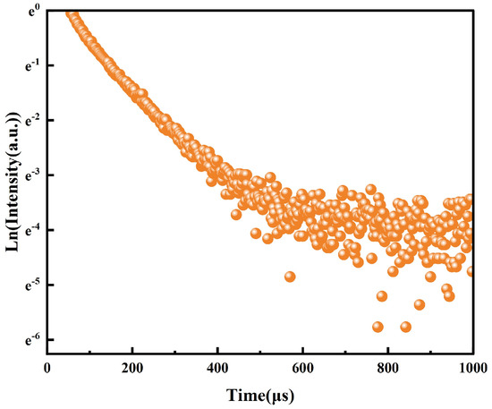 The fluorescence lifetime can be obtained by fitting the fluorescence decay curve according to a single exponential decay, I = A × exp(t/τ). Here, we employed a 1.0 at.% Nd: CYGA single crystal sample for theoretical calculations and measured the fluorescence decay of its emission at 1.06 μm upon excitation at 808 nm. The result is shown in Figure 3 and its fluorescence lifetime is 140 μs.