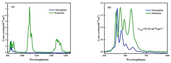 At room temperature, we measured the absorption spectrum and the emission spectrum at 808 nm excitation of the 1.0 at.% Nd: CYGA single crystal sample, calculating the absorption cross section and emission cross section. The results are shown in Figure 4. There is a clear spectral overlap at around 900 nm, as depicted in Figure 4b, which is attributed to the excited migration process resulting from the interaction of Nd3+ with 4F3/2 and 4I9/2 energy levels. According to the spectral overlap model, CDD = 75.75 × 10−40 cm6s−1 was calculated with Equation (15).
