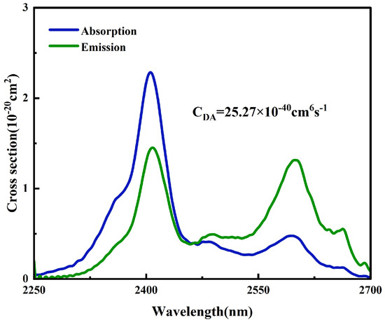 where h represents Planck’s constant, kB denotes Boltzmann’s constant, T (Kelvin temperature) signifies the experimental temperature, λZL represents the wavelength of the null line, and Zl and Zu are the degeneracy of lower and upper transition levels, respectively. According to Equation (17), the emission cross section in the vicinity of the ~2.4 μm band can be determined. Figure 4 shows the absorption and emission cross sections of the sample within the wavelength range of 2250 nm to 2700 nm. As depicted in Figure 5, there is an overlap between the absorption cross section and the emission cross section. This overlap is a result of the cross-relaxation process that occurs due to the interaction of the 4I15/2→4I11/2 emission spectrum and the 4I9/2→4I13/2 absorption spectrum of Nd3+. Hence, the spectral overlap model is utilized for this band, resulting in the determination of CDA = 25.27 × 10−40 cm6 s−1.