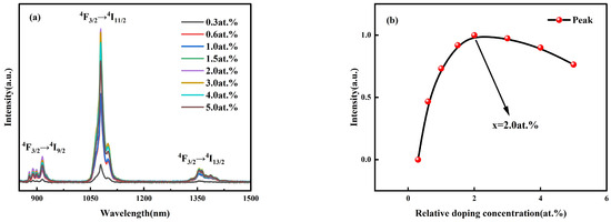 (a) Multi-concentration fluorescence intensity curve of Nd: CYGA; (b) Comparison of peak fluorescence intensity at different relative doping concentrations.