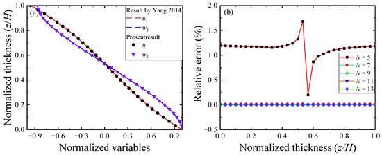 To validate the accuracy of the proposed method, a numerical example is solved for laminates with simply supported boundary conditions under normal stress (Equation (44)). The geometry and material properties of the plates are taken from the work of Yang et al. [12]. In this analysis, the effect of the electric field is neglected, and the phonon displacement of the laminates along the x3-direction is determined at the point (x1, x2) = (0.75L1, 0.75L2). The obtained results are compared with the literature [12] and shown in Figure 2a, demonstrating a high level of consistency. Furthermore, the influence of the number of discrete points on the accuracy of the results is analyzed in Figure 2b. It can be observed that the results tend to converge as the number of discrete points increases, with convergence occurring at N = 7. To ensure the accuracy of the results, a total of 13 discrete points are selected in this study.