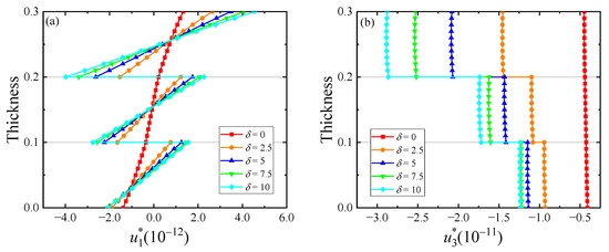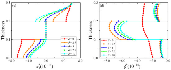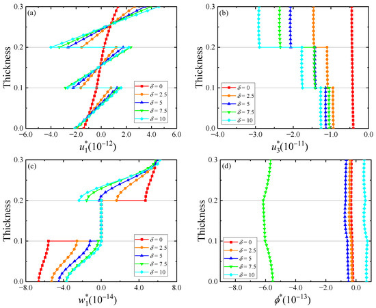For fixed (x, y) = (0.25L1, 0.25L2), Figure 3 and Figure 4 show the changes in displacements (electric potential) and stresses (electric displacements) along the thickness direction in sandwich QC/Q/QC laminates with SSSS lateral conditions and subjected to mechanical loads. Namely, the top and bottom surfaces of the laminate are, respectively, subjected to tensile pressure. The imperfect interface is dielectrically weakly conducting. When δ* = 0, the interface becomes perfectly connected. It can be seen from Figure 3 that u1, u3, and ϕ are continuous when δ* = 0, and the displacement (electric potential) at the interface will undergo a sudden change when δ* ≠ 0. Furthermore, it can be seen from Figure 3a,b that the overall stiffness weakens when δ* rises. The magnitude of w1 decreases with increasing interface imperfection, indicating that an imperfect interface could affect the local rearrangement of atoms. Figure 4a,b show that a mechanical load would generate a larger stress in the phonon field as compared with the stress in the phason field in Figure 4c. Furthermore, when the imperfect interface factor δ* increases, the maximum magnitude of the stress increases, leading to possible damage to the laminate being easily damaged. Figure 4d shows that the magnitude of the electric displacement D3 can be very small when considering the effect of the imperfect interface.