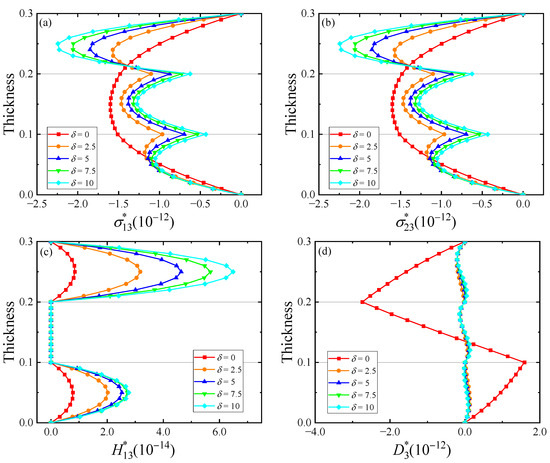 In this example, we assume that an electric load is applied on the top surface of a PQC laminate with a fixed gradient factor η = 0.5 and varying interface compliance δ*. The electric load is the vertical electric displacement assumed as