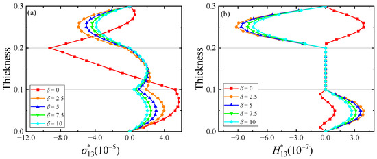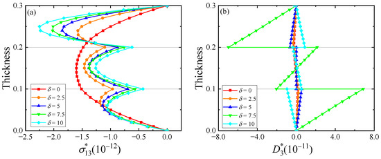 Variation of displacement and electric potential along the thickness direction of the FG QC/C/QC laminates under the electric load with different interface compliances δ* (dielectrically weakly conducting) (a) , (b) . Coordinates (x,y) = (0.25L1, 0.25L2).