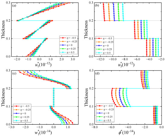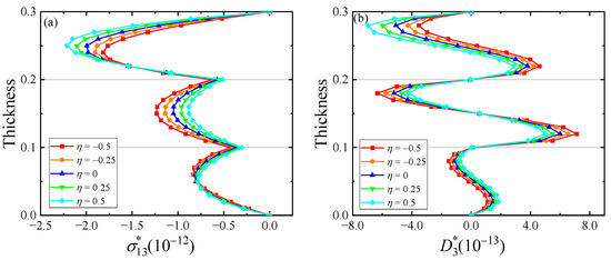 Figure 7 shows the distribution of displacements and electric potential along the thickness direction of FG laminates with different gradient factors. It can be seen from Figure 7 that these quantities vary significantly as η ranges from −0.5 to 0.5. When η = −0.5, the displacements on the top and bottom surfaces reach their maximum magnitude. Notice further that all these field quantities are discontinuous on the interfaces due to the assumed imperfection there. Figure 7d shows the electric potential ϕ has the largest magnitude in the middle layer and its value is more sensitive than those in the top and bottom layers, even though the middle layer is homogeneous. Figure 8 shows the distribution of stress and electric displacement along the thickness direction in FG laminates with different gradient factors. It is observed from Figure 8 that with increasing thickness from the bottom layer surface, the influence of the FG factor η increases. This feature could be related to the fact that the mechanical load is applied on the top surface.