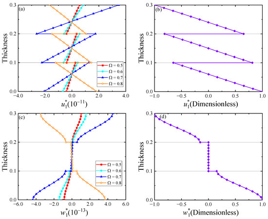 Figure 11 shows the variation of the displacements and the eigenmodes along the thickness direction of the sandwich laminate. While Figure 11a,c are for different loading frequencies, Figure 11b,d are the corresponding dimensionless eigenmodes at the fixed dimensionless natural frequency Ω = 0.7460. From Figure 11, the following features can be observed: (1) the displacement variation is roughly antisymmetric with respect to the middle plane of the sandwich; (2) at a fixed thickness value, the magnitude of the displacement increases with increasing loading frequency in the top and bottom layers when the loading frequency is less than the corresponding natural frequency. However, these displacements change their signs when the loading frequency is larger than the natural frequency; (3) the shape of the displacement at Ω = 0.8 is similar to that of the eigenmode in Figure 11b,d.