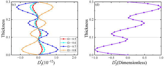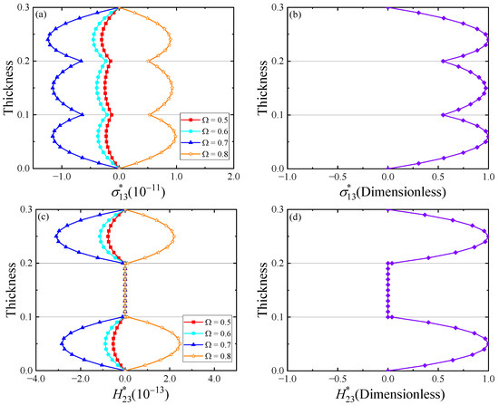 Figure 12 shows the variation of the stresses along the thickness direction, with Figure 12a,c for different loading frequencies, Figure 11b,d for the corresponding dimensionless eigenmodes at the fixed dimensionless natural frequency Ω = 0.7460. Comparing Figure 12 with Figure 11, we observe that the variation trend for the stresses is similar to that of the displacements. Namely, the three features listed for the displacement apply here for the stress. Similar features can be also seen for the variation of the electric potential and electric displacement along the thickness direction, as shown in Figure 13.