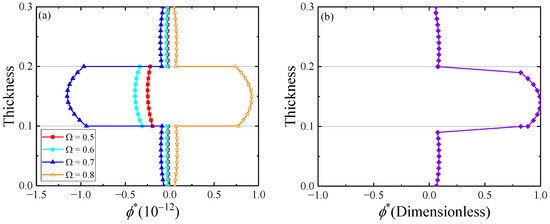 We consider now the case of a dielectrically highly conducting interface. Figure 5a–c show the variation of the phonon and phason displacements. By comparing it with the weakly conducting interface (Figure 3), we observe that these displacements are nearly the same, indicating that the dielectric interface condition has nearly no effect, no matter if it is highly or weakly conducting. However, the variations of the electric potential are completely different under different dielectric conditions (Figure 5d vs. Figure 3d). Similarly, while the imperfect interface condition has nearly no effect on the stress, its impact on the electric displacement D3 is obvious (Figure 6b vs. Figure 4d). For instance, while D3 is small under weakly conducting conditions (Figure 4d), it is large and increases its magnitude with increasing interface imperfection under the high conduction case.