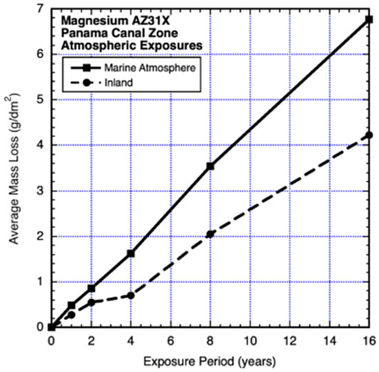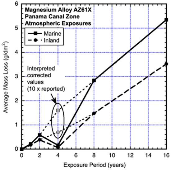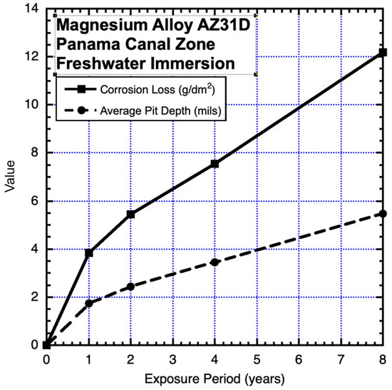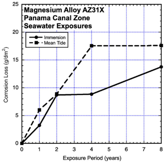 Some of the earliest and longest exposures of magnesium alloys were those conducted after the Second World War in the Panama Canal Zone under the auspices of the US Naval Research Laboratory (Southwell et al., 1964 [14]). The exposure tests were for alloys AZ31X and AZ61X for exposures in seawater, seawater half-tide (Christobel), freshwater (Gutan Lake), onshore marine atmosphere and inland atmosphere (Figure 1, Figure 2, Figure 3 and Figure 4). The test program used coupons 225 mm × 225 mm × 6.3 mm (9″ × 9″ × 1/4″) for immersion corrosion and similar 1.56 mm (1/16 inch) plates for atmospheric exposures. The marine atmosphere coupons were located at an elevation of 16 m above the Caribbean sea level on a hotel roof 100 m from the shoreline. The inland tests were located near the Miraflores locks, some 12 km from the Pacific Ocean coast. All coupons were mounted vertically. All were exposed in duplicate for 16 years, but the seawater and half-tide coupons of alloy AZ31X were too heavily corroded after year 8 to use for analysis. The reported data for alloy AZ61X in both the seawater immersion and the half-tide exposures show the year 4 losses being much lower than the earlier and the longer exposures (Figure 3). It is possible that the actual losses were 10 times greater than those recorded—the effect of this possibility is indicated in Figure 3.