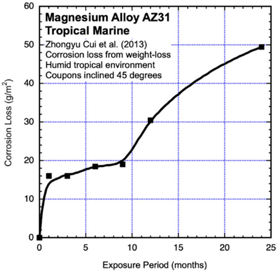 Data and added best-fit smooth trends for AZ31 coupons exposed to unprotected tropical marine atmosphere exposure conditions. Exposure period is in months. Data from Zhongyu Cui et al., 2013 [16].