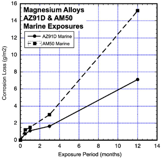 Test results for coupon mass loss were obtained at Brest, France, using coupons that were 130 mm × 100 mm × 3 mm thick of die-cast AZ31D and AM50, which were commercially supplied and polished down to 1200 grit. Three coupons were recovered at each recovery time point (Jonsson et al., 2008) [17]. The average mass-loss results are shown in Figure 6. It is clear that, overall, neither a linear nor a power-law function is appropriate to represent the trends in the data, noting that there are no data points between years 3 and 12. Although shown as a linear trend between these two points, this cannot be considered a definitive conclusion.