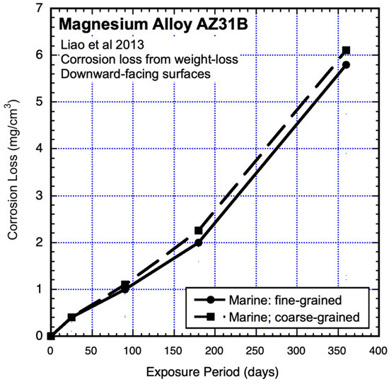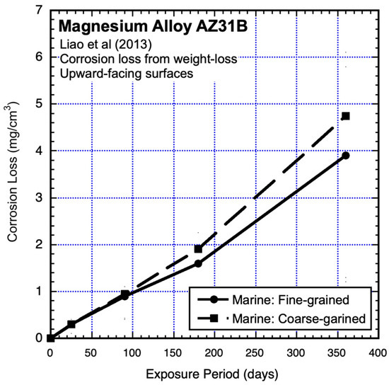 Atmospheric corrosion-loss tests were carried out in the marine environment of Shimizu City, Japan, and in the nominally urban environment of Osaka City, Japan. The tests used AZ31B coupons (120 mm × 70 mm × 4 mm) with exposed surfaces only upwards or only downward and also used both fine-grained and coarse-grained alloys with similar grain structures and textures (Jinsun Liao et al., 2013) [18]. The results from the marine environment are shown in Figure 7 and Figure 8 and those from the nominally urban environment in Figure 10 (see below). Even though these were short-term (one-year) exposures, it is clear that the data trends are not linear. Since they have an upward trend, they are not consistent with the possibility of a power law for longer exposures. However, as will be evident after considering bimodal trending below, they are consistent with the early part of such trending.