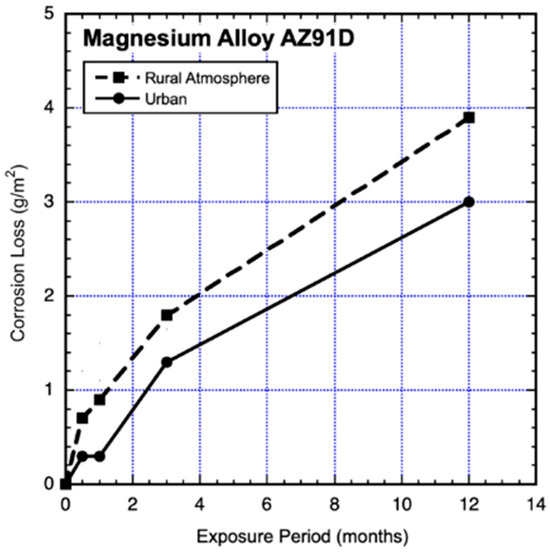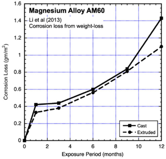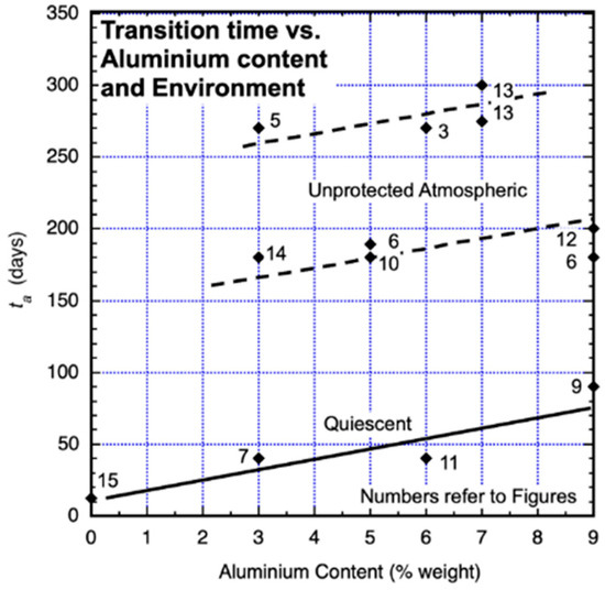Inspection of the trends in Figure 1, Figure 2, Figure 3 and Figure 5, Figure 6, Figure 7, Figure 8, Figure 9, Figure 10, Figure 11, Figure 12, Figure 13 and Figure 14 suggests that 0–ta appears to be influenced by alloy composition, in particular, the content of aluminium. This is summarised in Figure 17. Exposure environments such as the presence of water currents or bold exposure to weather conditions also have an influence. Both water currents and weather conditions, such as the impact of rainfall and of UV radiation, may affect the formation of protective (and other) corrosion products. This has been reported for steels in flowing seawater (Melchers and Jeffrey 2004 [33]). Similar effects can be expected for the generally weaker corrosion products formed by the corrosion of magnesium alloys. The original data sources for Figure 1, Figure 2, Figure 3, Figure 4, Figure 5, Figure 6, Figure 7, Figure 8, Figure 9, Figure 10, Figure 11, Figure 12, Figure 13, Figure 14 and Figure 15 did not record detailed environmental conditions. However, the summary of information in Figure 17 suggests both a trend with aluminium content and one with exposure conditions. On the other hand, comparisons of Figure 1, Figure 2, Figure 3, Figure 4, Figure 5, Figure 6, Figure 7, Figure 8, Figure 9, Figure 10, Figure 11, Figure 12, Figure 13 and Figure 14 suggest little effect on corrosion loss from grain size or casting versus extrusion.