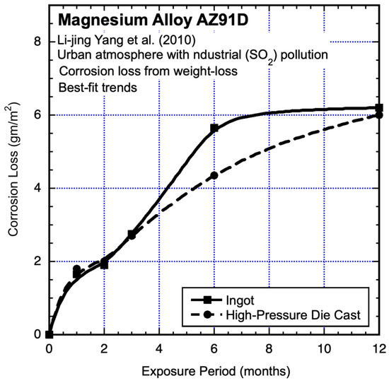 Data and added best-fit trends for AZ91D magnesium alloy exposed to an urban environment with industrial pollution, also showing effects of ingot casting versus high-pressure die casting. Exposure period is in months. Data from Li-jing Yang et al. (2010) [20].