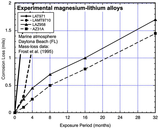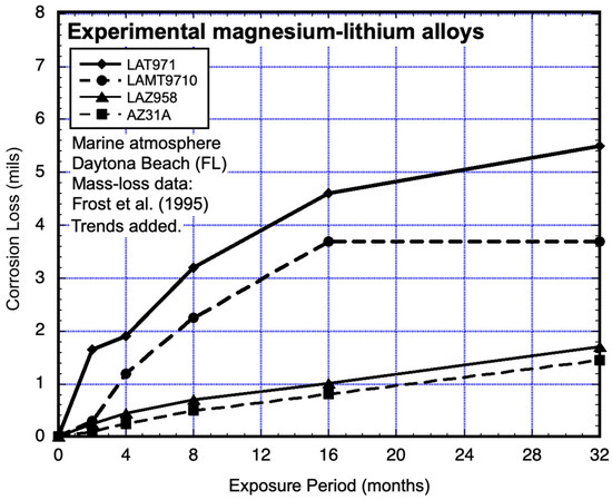 Some early investigations showed that alloying with lithium has been found to have a positive effect on magnesium strength. Some of the various lithium alloys have been found to have good corrosion resistance in 3% NaCl solutions. The more resistant of the alloys were tested at the marine atmosphere corrosion test site located about 19 km south of Daytona (FL) and about 150 m from the shore of the Atlantic Ocean. The tests used coupons 4 inch × 6 inch × 0.064 inch thick (100 mm × 150 mm × 1.7 mm), inclined 30° to the horizontal and facing south. The mass-loss data for the alloys tested are shown in Figure 13, together with observations for magnesium alloy AZ31A, which was tested at the same time in the same location (Frost et al. 1955) [21]. Piecewise trend lines have been added to all the data. The least resistant alloys (LAT971 and LAMT9710, Table 1) display inconsistencies with a power-law function in the first 2–4 months of exposure. Neither data set is consistent with a linear function.