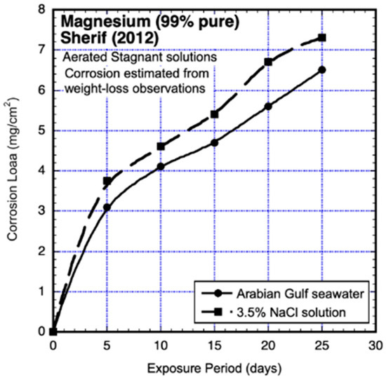 - Sherif, E.-S.M. Corrosion behavior of magnesium in naturally aerated stagnant seawater and 3.6% sodium chloride solutions. Int. J. Electrochem. Sci. 2012, 7, 4235–4249. [Google Scholar] [CrossRef]
