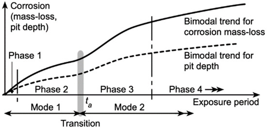 In summary, comparison of the data sets and the trends for Figure 1, Figure 2, Figure 3, Figure 4, Figure 5, Figure 6, Figure 7, Figure 8, Figure 9, Figure 10, Figure 11, Figure 12, Figure 13, Figure 14 and Figure 15 reveals that they exhibit consistency with the bimodal model of Figure 16 to a greater or lesser degree. The only possible exception is Figure 4. However, care is required. In this case, comparison with the other data sets suggests that in Figure 4, the available data are spaced at intervals that effectively hide the period 0–ta—that is, it likely falls within the first year, and, thus, within the first period of observations of mass loss. In this case, the change from Mode 1 to Mode 2 would not be seen in the trend derived from the data. This demonstrates the importance of the planning of experiments to enable extraction of the information being sought (cf. Melchers and Jeffrey 2022 [10]).