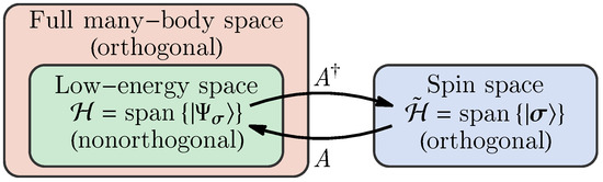 The lattice model in Equation (1) is defined in the full many-body Hilbert space spanned by the orthogonal Fock states of electrons, which includes a low-energy subspace is spanned by the nonorthogonal trial states in Equation (6). A spin Hilbert space spanned by the orthogonal Ising basis is introduced to represent the effective spin model. The linear map A (and ) connects and .