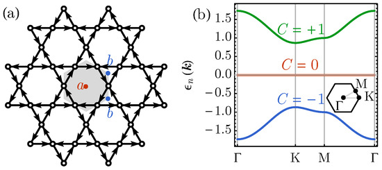 The middle band is strictly flat with zero Chern number , which is an obstructed trivial band. Its Wannier obstruction is only due to the lack of lattice sites at the hexagon center Wyckoff position, such that the obstruction can be lifted by adding empty sites. The top and bottom bands are Chern bands of Chern number , respectively. They combined together to form a set of fragile topological bands, which are Wannier-obstructed and do not admit an effective tight-binding model description (despite their total Chern number being zero) [33,61], because the symmetry representations at high-symmetry momentum points do not match those of any atomic insulators of the same lattice symmetry. This situation is analogous to the middle bands in the tBLG around the charge neutrality, which has a fragile topological band structure for each valley [32,37]. Placing the tBLG on the aligned hexagonal boron nitride (hBN) substrate further opens up the band gap at charge neutrality. The top and bottom bands are valley Chern bands of opposite Chern numbers [15], which resemble the Chern bands in the Kagome lattice model as in Figure 2b. Similar Chern bands also appeared in Kagome lattice materials Cs2LiMn3F12 [62] and Co3Sn2S2 [63,64]. The Chern number is correlated with the spin state due to spin–orbit coupling effects.
