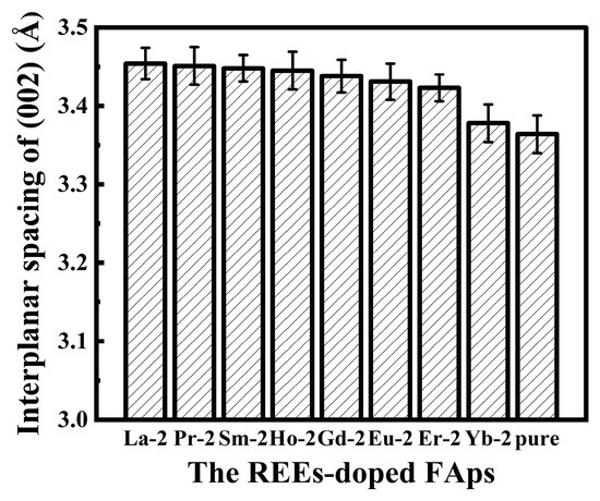The interplanar spacing of the (002) lattice planes of the pure and REEs-doped FAps.