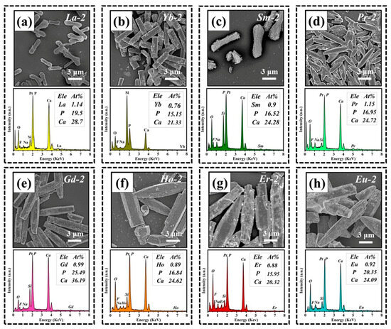 The SEM images accompanied by EDS spectra of the (a) La-2, (b) Yb-2, (c) Sm-2, (d) Pr-2, (e) Gd-2, (f) Ho-2, (g) Er-2, and (h) Eu-2 FAps.