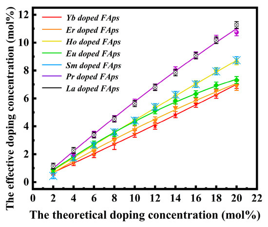Similar with the Er- and Eu-doped FAps, the SEM images and EDS spectra of the La-, Pr-, Sm-, Gd-, Ho-, and Yb-doped FAps also demonstrate that the REE ion doping concentration shows no effect on the average grain size. Figure 7 shows the effective doping concentration of the La-, Pr-, Sm-, Eu-, Gd-, Ho-, Er-, and Yb-doped FAps. It can be seen that the effective doping concentration of the REEs-doped FAps increases with the increasing theoretical doping concentration. Nevertheless, the ratio of the effective doping concentration to the theoretical doping concentration is around 50%. And this ratio gradually decreases as the theoretical doping concentration increases, like Eu-doped FAps. The main reason is that the additions of superabundant cations are more likely to precipitate directly instead of forming REEs-doped FAps.