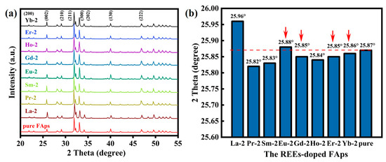 Figure 8 shows the phase and crystal structure of the La-2, Yb-2, Sm-2, Pr-2, Gd-2, Ho-2, Er-2, and Eu-2 FAps by the XRD patterns and the degree of (002) diffraction peak. The diffraction peaks of the REEs-doped FAps are in good agreement with the standard spectrum peaks of the FAps, which indicates that the formation of the phase structure of the pure and REEs FAps. As shown in Figure 8b, the diffraction peak corresponding to the (002) crystal plane of the La-2, Yb-2, Sm-2, Pr-2, Gd-2, Ho-2, Er-2, and Eu-2 FAps exhibits variable shifts, attributable to the distinct atomic radii of the dopant atoms. The red dotted line in Figure 8b represents the (002) crystal plane angle of the pure FAps. Compared to the peak positions of the Yb-2, Gd-2, Er-2, and Eu-2 FAps, the La-2, Sm-2, Pr-2, and Ho-2 FAps show a visible lattice distortion.