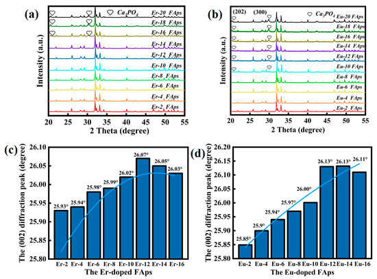The XRD patterns for the Er-2, 4, 6, 8, 10, 12, 14, and 16 FAps and Eu-2, 4, 6, 8, 10, 12, 14, and 16 FAps are illustrated in Figure 9. It can be seen in Figure 9a,b that the Er-2, 4, 6, 8, 10, 12, 14, and 16 FAps and Eu-2, 4, 6, 8, 10, 12, 14, and 16 FAps can be synthesized successfully when the theoretical doping concentration is less than 20%. As the theoretical doping concentration approaches 20%, the XRD patterns of Er-16, 18, and 20 and Eu-10, 12, 14, 16, 18, and 20 FAps show the abrupt diffraction peaks at 20.21° and 29.65° that do not belong to the FAps phase. These diffraction peaks are analyzed to the (202) and (300) characteristic peaks of the calcium phosphate phase. The angle of the (002) diffraction peak changing with the effective doping concentration in Figure 9c,d illustrates that numerous Er3+ ions or Eu3+ ions entering the FAps lattice led to distortion [27]. According to the Bragg Equation (2dsinθ = nλ), the increase in the 2-theta angle in Figure 9c,d is attributed to the decrease in interplanar crystal spacing of the (002) plane resulting from Er atom doping.