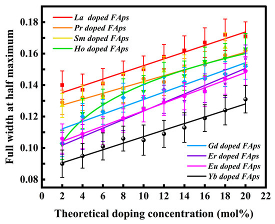 The FWHM of the (002) lattice plane in the REEs-doped FAps is calculated in order to roughly understand the influence of the theoretical doping concentration on the lattice defects in the FAp-phase crystal. It can be seen in Figure 10 that the FWHM of REEs-doped FAps increases with the increase in theoretical doping concentration, indicating that the degree of crystallinity gradually decreases [27]. The La-, Pr-, Sm-, and Ho-doped FAps show higher FWHM compared to Gd-, Er-, Eu-, Yb-doped FAps, resulting in the Gd-, Er-, Eu-, and Yb-doped FAps having better crystallinity.