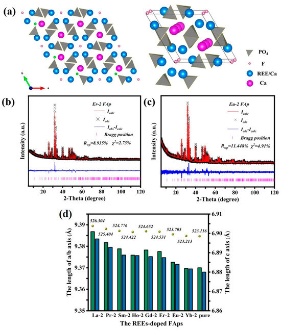The XRD patterns of REEs-doped FAps were refined, and the Rietveld calculation was performed using GSAS II to obtain the crystal structure model [28]. The Rwp of the Er-2 and Eu-2 FAps is, respectively, 8.935% and 11.448%, while the χ2 is, respectively, 2.73% and 4.91%. The smaller error coefficient indicates that the refinement results are more reliable. From Figure 11b,c, the black cross represents the measured XRD data, the red solid line represents the XRD data fitted based on the computational structural model, the bule solid line represents the difference between the measured data and the fitted data, and the magenta columnar line represents the position of the Bragg diffraction peak. The difference between the measured XRD diffraction peaks calculated by fitting is small and the fitting results are calculable. The refined results are listed in Table 2. Based on the crystallographic files generated by GSAS II, Vesta was used to create a lattice structure of REEs-doped FAps, as is shown in Figure 11a. In the hexagonal crystal structure, two cationic lattice positions, namely the Ca1 and Ca2 positions, are present. Nevertheless, distinct rare-earth atoms exhibit specific tendencies for occupying these lattice positions. Notably, Er and Eu are inclined to preferentially occupy the 6h position [29]. According to the Rietveld refinements of the XRD patterns of the REEs-doped FAps, the unit cell volume and lattice constants were calculated out and plotted in Figure 11d. Visibly, in Figure 11d, the unit cell volume and lattice constants of the Gd-2, Er-2, Eu-2, and Yb-2 FAps are closer with the pure FAps without REEs doping. It can be concluded that the lattice distortion of the Gd-2, Er-2, Eu-2, and Yb-2 FAps is weaker compared with that of the Pr-2, La-2, Sm-2, and Ho-2 FAps.