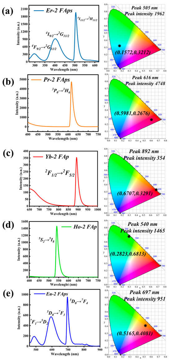 Fluorescence properties of Er-2/Pr-2/Yb-2/Ho-2/Eu-2 FAps: (a–e) the emission spectrum of REEs-doped FAps and FAps at the wavelength of 250 nm and its corresponding CIE color co-ordinates.