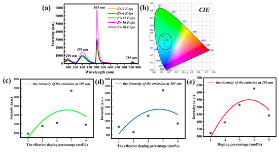 Fluorescence properties of Er-2, 6, 12, 16, and 20 FAps: (a) emission spectra under excitation at 250 nm; (b) the CIE color co-ordinates; (c–e) fluorescence intensity of various emission bands (296 nm/401 nm/505 nm) changes with the effective doping concentration.