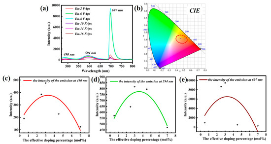Fluorescence properties of Eu-2, 6, 8, 10, 14, and 16 FAps: (a) emission spectra under excitation at 250 nm; (b) the CIE color co-ordinates; (c–e) fluorescence intensity of various emission bands (490 nm/594 nm/697 nm) changes with the effective doping concentration.