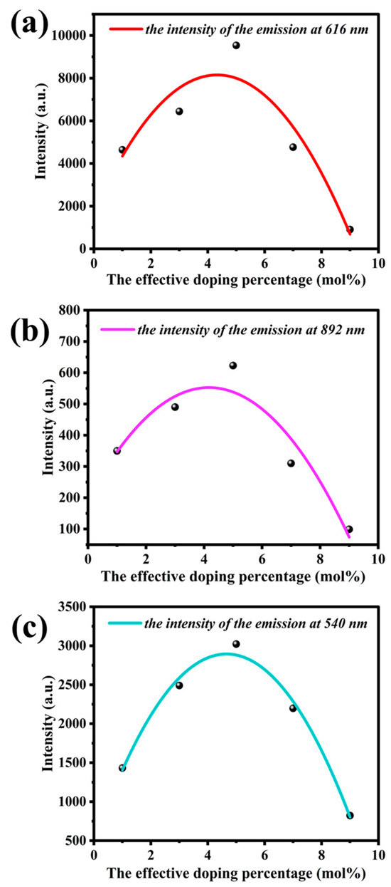Figure 15a–c show the trend of the changes in fluorescence intensity of the Pr-, Yb-, and Ho-doped FAps with effective doping concentration. Consistent with Eu and Er, the fluorescence intensity of Pr-, Yb-, and Ho-doped FAps, moreover, increase first and then decreases as the effective doping concentration increases. The optimal effective doping concentrations of Pr, Yb, and Ho are 4.5, 4, and 5 mol%.