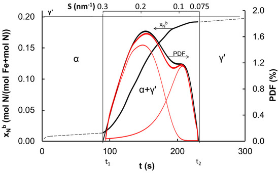 Figure 1 presents some exemplary results of the measurement of nitrogen concentration by volume of the catalyst sample, xNb, in the process of nitriding with ammonia at 748 K of iron catalyst reduced in hydrogen at 773 K. Vertical lines indicate the times t1 and t2, at which the α → γ′ phase transformation of iron nanocrystallites with the smallest and the largest sizes, respectively, took place.