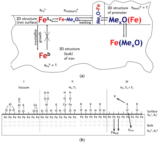 The morphology of nanomaterials may be the result of establishing the thermodynamic equilibrium between the surface and volume of nanocrystallites and the components located in the spaces between the nanocrystallites (Figure 4a) [24]. Based on studies in the nanocrystalline-Fe(Al2O3, CaO, K2O) system under ultrahigh vacuum conditions, a surface model was presented [56], according to which the surface of nanocrystalline iron is fully wetted with a double layer of atoms, where the promoter ion is bound to the surface through the oxygen ion (Figure 4(bI)). This hypothesis has been used in the interpretation of phenomena occurring on the surface of iron catalyst [24,59,60,67,71,72]. It was found in [53,73,74] that oxygen may be present on the iron surface in a hydrogen atmosphere. At 470 K under vacuum conditions, potassium desorbs from the iron surface [52,74]. The potassium ion is stably bound to the iron surface in the presence of oxygen [52,53,73,74].