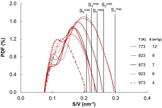 Probabilities of the distribution densities of specific surface areas of nanocrystalline iron sintered at different temperatures within the range of 773–973 K (black lines—measurement results; red lines—fitting results).