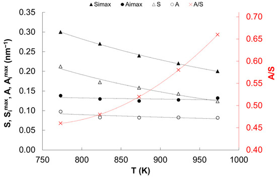 Dependence of the specific surface Simax (nm−1), the active specific surface Aimax (nm−1) of the smallest nanocrystallite in the i-th sample; the specific surface S (nm−1), the active specific surface A (nm−1) and the ratio of the active area to the total area of the whole sample A/S on the temperature.