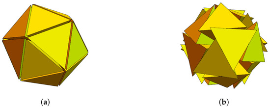 The fact that this quasicrystal was related to the ESQC was not entirely surprising, since the ESQC has symmetry and is known to contain symmetric cross-sections [24]. Somewhat more surprising, perhaps, was the fact that the relationship with the FIG was not based on such a cross-section, but on a tetrahedrally symmetric cross-section which was then compounded 5-fold in 3D. This is related to the fact that the icosagrid itself can be seen as a 5-fold compound of tetragrids, just as the vertices of a dodecahedron (icosahedrally symmetric) are given by a compound of five tetrahedra (Figure 1). (Throughout this paper, we shall often identify a polytope or compound with its vertices when we think this will not cause confusion; in certain cases in which we need to draw attention to the facets and distinguish between, for example, a compound and its convex hull, we will make that explicit.) This connection between a crystallographic and a non-crystallographic symmetry in the same dimension is intriguing, leading one group of researchers to call octahedral symmetry “latent” in icosahedral polyhedra, and vice versa [25].